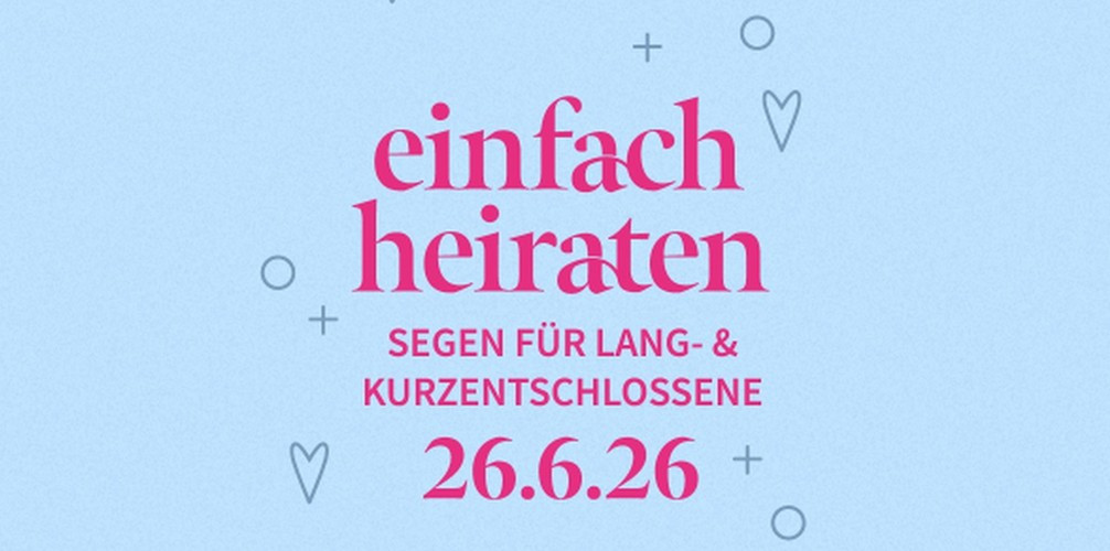 Jetzt ist eure Chance: Einfach heiraten! Sagt Ja zueinander und erhaltet Gottes Segen für eure Partnerschaft. Unkompliziert bei der Evangelisch-Lutherischen Kirche in Bayern. Ob frisch verliebt, lang verheiratet oder einfach ein Segen für die Beziehung. Euer Ja-Wort wartet auf euch! Selbsverständlich sind alle Paare herzlich willkommen.