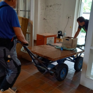 März 2024 - Entsorgung der Bretter des alten Holzbodens, Muster für den neuen Boden, Vorbereitung für Verlegung der neuen Bretter