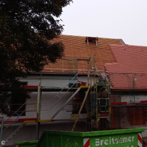 26.-29.09.2023 - Das Dach wird abgedeckt, die neue Dachpappe befestigt, die Fensternischen ausgeschlagen und der Banner für den Bauzaun geliefert