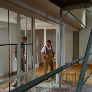 Januar 2024 - das neue Lichtfenster wurde eingebaut, die Säule gestockt , die Wand im Jugendraum zugemauert. Vorbereitung für das Legen der Bodenfließen und Besprechung vor Ort zu den Prinzipalia